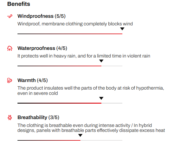 The outer part is made of 2-layer material with a 10,000 mm H₂O membrane and breathability of 10,000 g/m²/24h, which effectively protects against wind and water while maintaining breathability. The PFC-free WR surface treatment repels water and increases dirt resistance. The jacket is additionally equipped with synthetic insulation, a snow skirt, inner cuffs, and wind protection under the main zipper, ensuring thermal comfort even during all-day skiing.