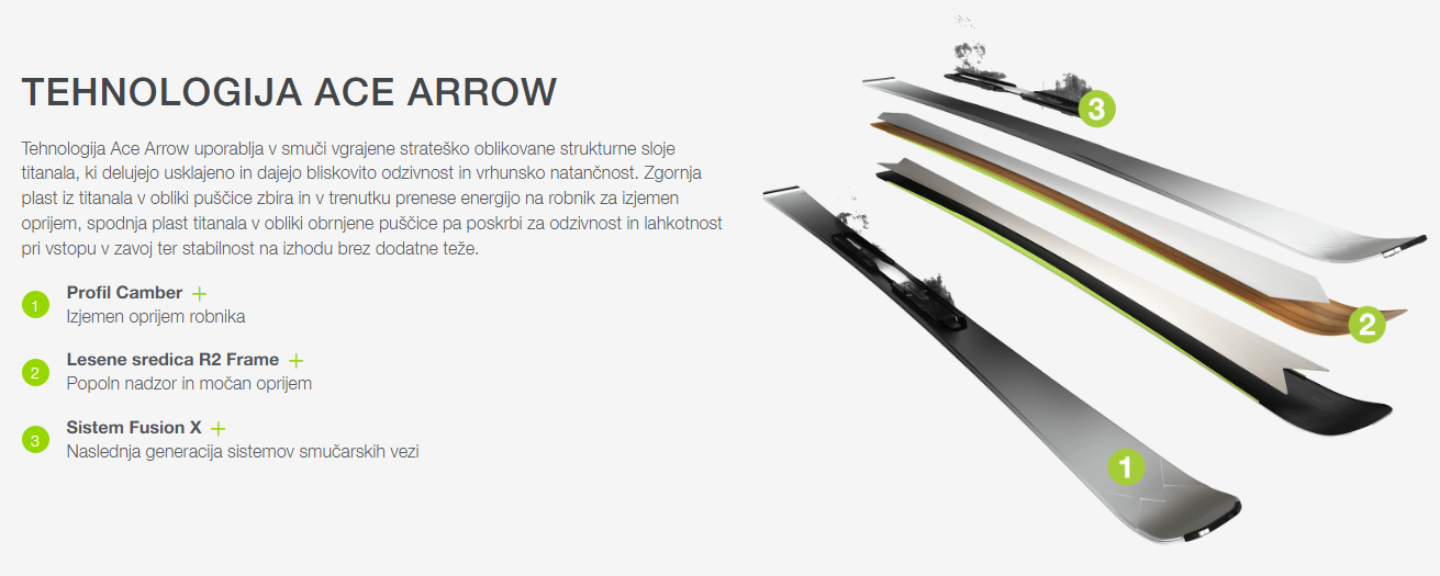 Zahvaljujoč inovativni tehnologiji Ace Arrow, ki z dodatnim slojem titana v obliki puščice usmerja energijo neposredno na robnike, te smuči zagotavljajo izjemen oprijem in natančnost v zavojih. Klasičen profil omogoča hiter, odziven vstop v zavoj, medtem ko Power Rebound System in Fusion X sistem vezi povečata moč in energijo pri odboju iz zavoja.